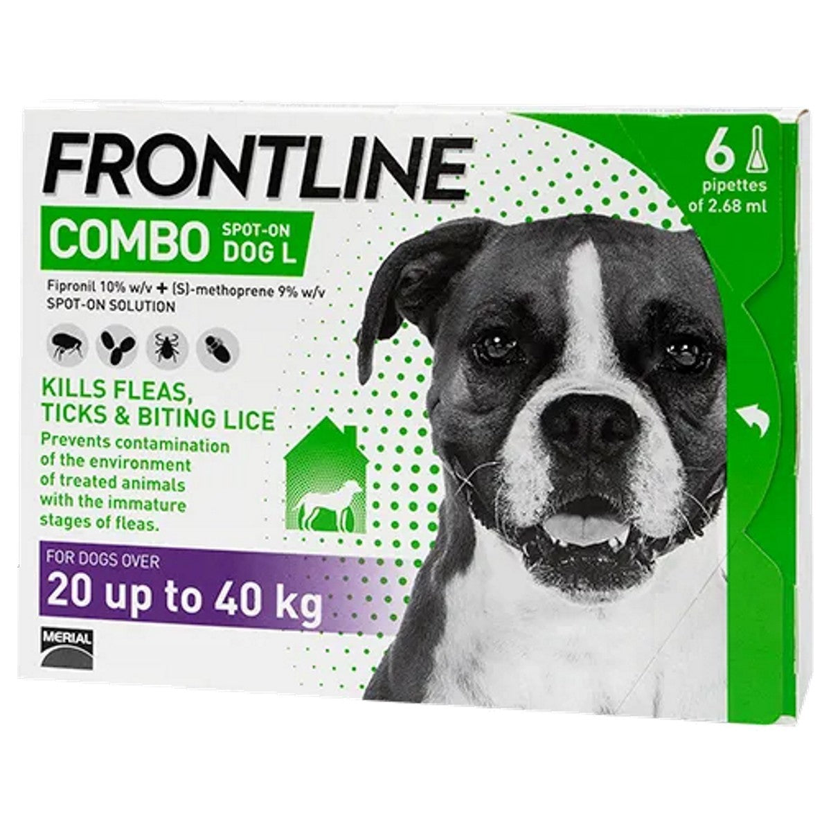 Frontline Combo Spot-On for Large Dogs is indicated to be used against infestations with fleas, alone or in association with ticks and/or biting lice on dogs weighing 20 – 40kg.